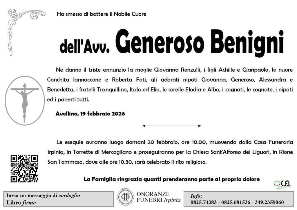 Con Generoso Benigni si chiude una stagione importante della vita pubblica avellinese. Resta l’eredità di un uomo che ha saputo unire pensiero e azione, diritto e impegno civile, passione e misura. In un tempo spesso segnato da divisioni e superficialità, il suo esempio richiama alla centralità del merito, della competenza e del rispetto delle istituzioni. Valori che, oggi più che mai, rappresentano un patrimonio.