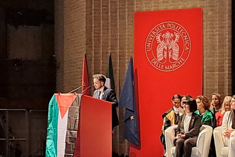 Gianluca Ferri, rappresentante del Consiglio studentesco dell’Univpm, ha aperto il suo intervento in maniera insolitamente diretta e visivamente potente. Con la bandiera palestinese srotolata davanti a sé, ha dedicato il suo discorso alle vittime della recente violenza a Rafah, subito evidenziando il legame tra l’evento accademico e le correnti più ampie dei conflitti internazionali.
