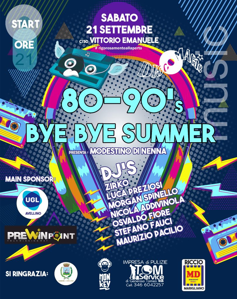 Grande attesa per l’evento dance dal titolo “Bye Bye Summer – La notte dei Dj’s” che si terrà sabato 21 settembre, alle ore 21:00 , nella location di Corso Vittorio Emanuele ad Avellino (all’altezza del palazzo di Governo, Prefettura di Avellino). Dopo il successo del 16 agosto, gli storici Dj’s avellinesi degli anni 90 si ripropongono con un secondo avvenimento spettacolare all’insegna della musica del passato che viene dal futuro, la musica dance mai tramontata quella degli anni 80 e 90. Vocalist della serata il regista Modestino Di Nenna che affiancherà i protagonisti dello show dance, in consolle: Enzo Zirko, Luca Preziosi, Morgan Spiniello, Nicola Addivinola, Osvaldo Fiore, Maurizio Pacilio e il giovane Stefano Fauci. L’idea di questa serie di manifestazioni è riproporre alcuni degli eroi della musica dance degli anni 90, personaggi iconici delle generazioni di quell’epoca che hanno lasciato una traccia indelebile, nei locali e nelle piazze di tutta l’Irpinia grazie ai loro straordinari mixaggi. Le tappe del gruppo denominato “Disco Magic” sono in continua evoluzione, difatti la prossima fermata sarà il 26 ottobre al “Time Event” di Monteforte Irpino. Appuntamento, quindi, a sabato 21 settembre ore 21:00 con l’evento dance 80 – 90 dal titolo “Bye Be Summer – La Notte dei Dj’s”, quando la musica del passato ha un contratto e un contatto con il pubblico a tempo indeterminato.