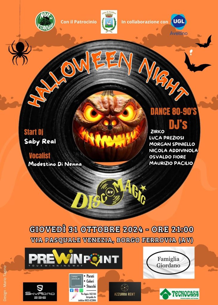 Dopo il successo di pubblico, collezionato durante il tour estivo e autunnale, i Disco Magic, continuano la loro avventura nella provincia di Avellino, diffondendo la musica del passato che viene dal futuro, la dance music mai tramontata, quella degli anni 80 e 90. Questa sera in occasione della festività di “Halloween”, gli storici disc Jockey irpini, accompagnati dalla voce del regista Modestino Di Nenna, si esibiranno nella località di Borgo Ferrovia ad Avellino. In consolle: dj Enzo Zirko, dj Luca Preziosi, dj Nicola Addivinola, dj Morgan Spiniello, dj Osvaldo Fiore e dj Maurizio Pacilio. Ci sarà anche la partecipazione del dj Saby Real originario di Borgo Ferrovia. Il successo del gruppo irpino di Disc Jockey è dovuto anche alla fattiva collaborazione di UGL Avellino e Prewinpoint. Quella di questa sera (31 ottobre 2024) sarà una festa all’insegna della buona musica dance. L’evento spettacolare musicale “Halloween Night” avrà inizio alle ore 21:00.