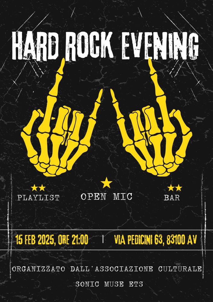 Continua l’appuntamento culturale-musicale, presso l’Associazione Culturale Sonic Muse ETS, di Avellino, alle ore 21:00. Questa volta, la serata sarà a base di musica Hard Rock, e tutti gli amanti del genere avranno la possibilità di ascoltare band iconiche che hanno lasciato un segno indelebile nel panorama musicale mondiale, come: i Led Zeppelin, gli AC/DC, i Van Halen, i Kiss, i Mötorhead, i Guns N’ Roses, gli Aerosmith, i Deep Purple, i Mötley Crüe ecc. Seguirà l’Open Microphone (Microfono Aperto) in cui chiunque è libero di salire sul palco della Sonic Muse e di usufruire della sua strumentazione, per recitare una poesia, cantare una canzone, raccontare una storia, esibirsi in una qualsiasi performance artistica. Alla Sonic Muse Ets, che è un circolo Arci, il tesseramento, previa approvazione dell’amministrativo, è obbligatorio. La tessera Arci ha un costo di soli 10 euro annui ed è valida in tutti i circoli Arci d’Italia. Inoltre con la tessera Arci, si ha diritto a una scontistica molto vantaggiosa e che comprende diverse sfere (cinema, teatro, tatuaggi, ristorazione, farmacia, fumetteria, quotidiani, riviste etc.), ad Avellino. Gli sconti per i soci Arci continuano poi in tutt’Italia per quanto riguarda cinema, teatri, musei, siti archeologici, campeggi, vacanze, turismo ecc. Infine, ricordiamo che tutti gli eventi sono sempre pubblicizzati sui Canali Social della Sonic Muse e sul Portale Arci.