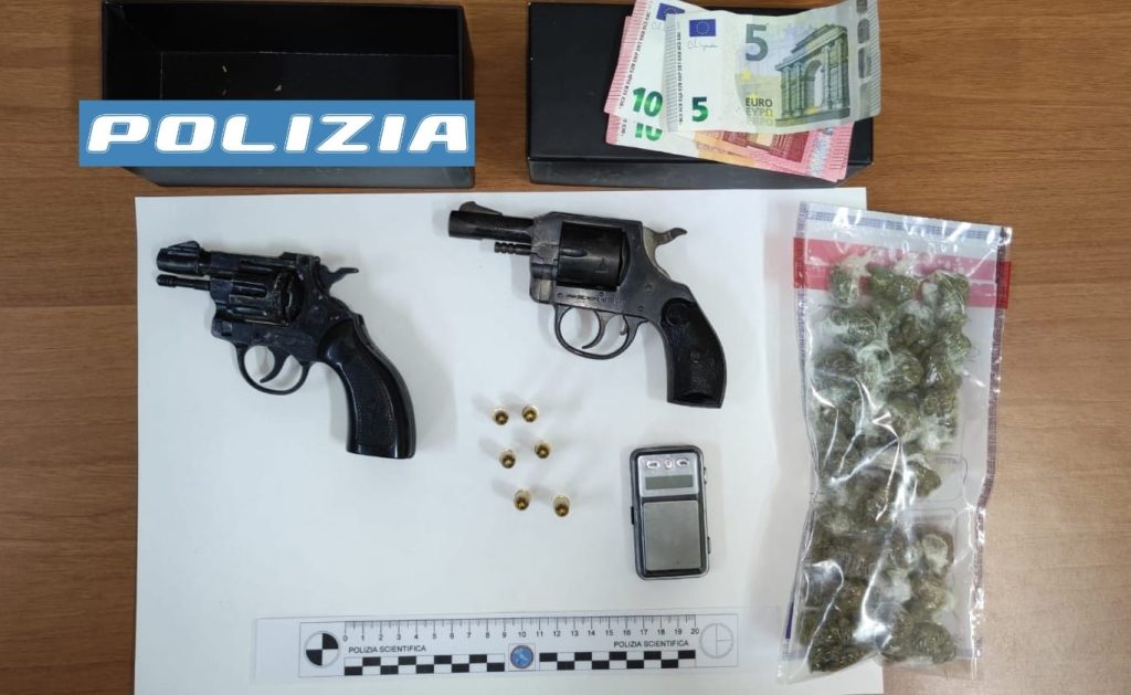 La Polizia di Stato di Caserta ha arrestato un 25enne, originario di Napoli, per detenzione ai fini spaccio di sostanze stupefacenti ed il possesso di armi clandestine. In occasione di servizi effettuati a Castel Volturno per il contrasto dello spaccio di stupefacenti, poliziotti della Squadra Mobile e del Commissariato di pubblica sicurezza hanno effettuato una perquisizione all’interno dell’abitazione del giovane, conosciuto per i suoi precedenti e già ristretto agli arresti domiciliari. Nascosta nel bagno, è stata trovata una busta con marijuana, già suddivisa in dosi, un bilancino di precisione e contante, provento di spaccio. In una borsa, inoltre, sono stati scoperti due “revolver”, detenuti abusivamente, di cui uno già armato e pronto al fuoco. L’uomo è stato arrestato ed associato alla Casa circondariale di Santa Maria Capua Vetere, in attesa del giudizio di convalida.