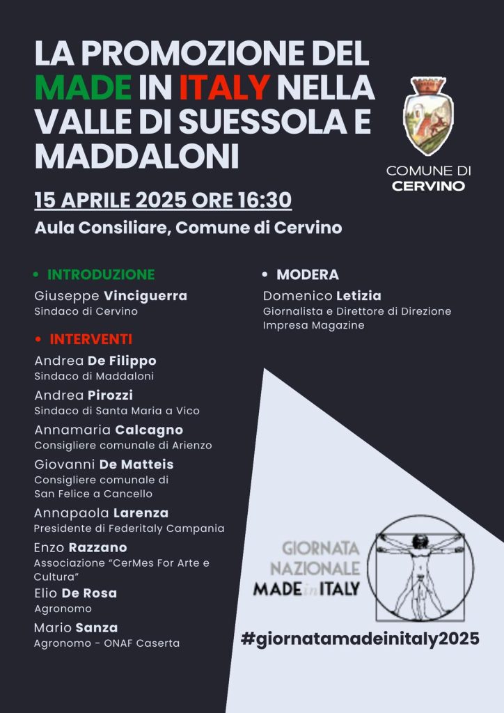 Il 15 aprile si svolge la seconda edizione della Giornata nazionale del made in Italy, promossa dal Ministero delle Imprese e del made in Italy. La data del 15 aprile è quella della nascita di Leonardo Da Vinci, simbolo del genio e del talento italiano. Il Comune di Cervino, in provincia di Caserta, in occasione delle celebrazioni, organizza un convegno dal titolo “La promozione del Made in Italy nella Valle di Suessola e Maddaloni”, in programma per martedì 15 aprile 2025 alle ore 16:30 presso l’Aula Consiliare del Comune di Cervino. L’iniziativa si inserisce nel calendario nazionale di eventi dedicati alla valorizzazione del sistema produttivo italiano, promuovendo le eccellenze locali e il legame tra territorio, cultura e impresa. Ad aprire i lavori sarà Giuseppe Vinciguerra, Sindaco di Cervino. A seguire gli interventi di numerose personalità istituzionali e rappresentanti del mondo istituzionale, culturale e agricolo: Andrea De Filippo, Sindaco di Maddaloni; Andrea Pirozzi, Sindaco di Santa Maria a Vico; Annamaria Calcagno, Consigliera comunale di Arienzo; Giovanni De Matteis, Consigliere comunale di San Felice a Cancello; Annapaola Larenza, Presidente di Federitaly Campania; Enzo Razzano, Associazione “CerMes For Arte e Cultura”; Elio De Rosa, Agronomo e Mario Sanza, Agronomo – ONAF Caserta. Il convegno sarà moderato dal giornalista Domenico Letizia, direttore di Direzione Impresa Magazine. L’agricoltura e l’agroalimentare, grazie alle nostre produzioni di alto pregio, possono affermarsi sia sul mercato nazionale che internazionale. L’incontro vuole essere un momento di confronto e riflessione sulle politiche di promozione del Made in Italy nelle aree interne, puntando a rafforzare le sinergie tra istituzioni, imprese e cittadini per lo sviluppo economico e culturale dei territori della Valle di Suessola e di Maddaloni. Tentare di responsabilizzare l’opinione pubblica per promuovere la tutela del valore e delle qualità peculiari dei prodotti italiani consente di accrescere le potenzialità del territorio e rafforzare il ruolo delle imprese agroalimentari.