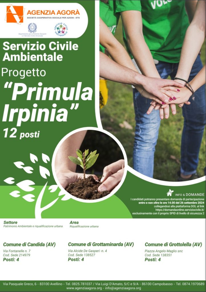 Si ricorda ai giovani tra i 18 e i 28 anni che c’è ancora tempo per partecipare al Bando di Servizio Civile Ambientale.  La selezione per operatori volontari nel settore “Patrimonio ambientale e riqualificazione urbana”,   scadrà  alle ore 14:00 del 26 settembre 2024.  Il Progetto dal titolo “Primula Irpinia”, finanziato all’Agenzia Agorà in regime di convenzione con il Comune di Grottaminarda, dal Dipartimento per le Politiche Giovanili ed il Servizio Civile Universale, prevede il reclutamento di  quattro giovani operatori per un monte ore settimanali ciascuno di 25 ore, regolarmente retribuite.  I candidati possono produrre domanda di partecipazione all’Agenzia Agorà attraverso la piattaforma DOL raggiungibile tramite PC, tablet e smartphone, all’indirizzo https://domandaonline.serviziocivile.it .   Attraverso “Primula Irpinia” il Comune di Grottaminarda intende favorire la cura, la tutela e la riqualificazione degli spazi pubblici con interventi di monitoraggio, pulizia e manutenzione del verde pubblico, cercando di aumentare la fruibilità da parte dei cittadini delle aree verdi e degli spazi comuni.