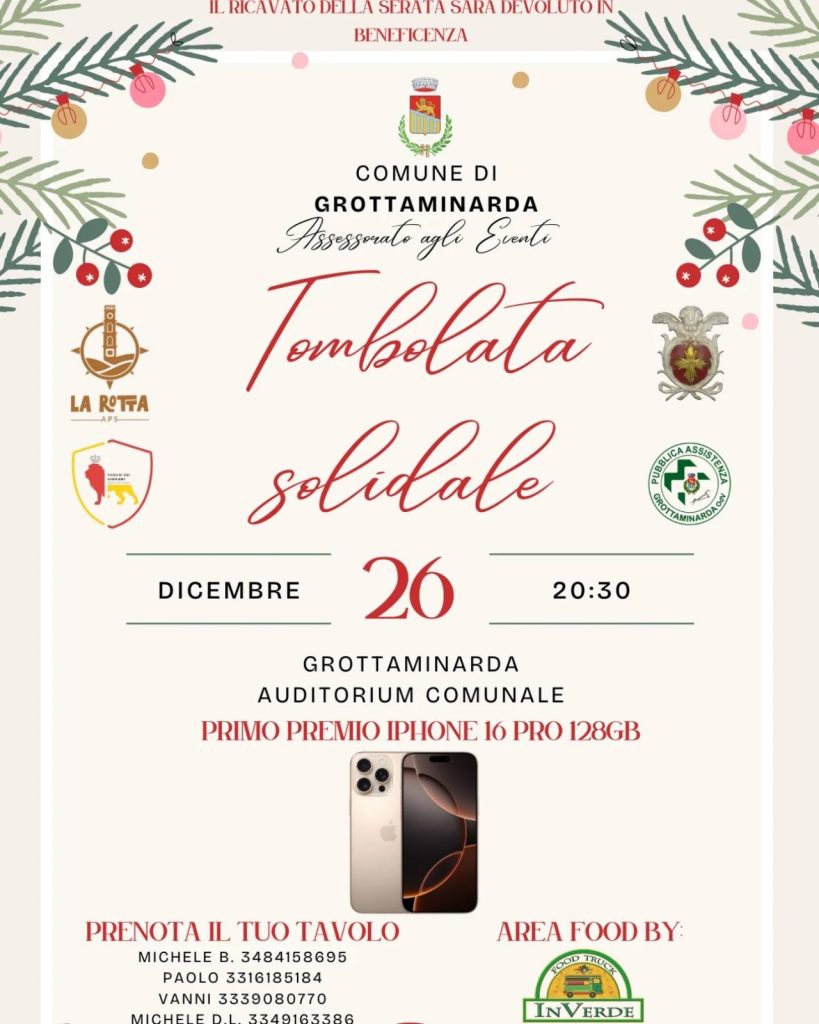 Questa sera, giovedì 26 dicembre, “Tombolata Solidale di Natale” a cura del Comune di Grottaminarda, de La Rotta Aps, della Pubblica Assistenza Grottaminarda, della Parrocchia di Santa Maria Maggiore e del Forum dei Giovani. La manifestazione che si inserisce del cartellone “É Tempo di Natale” promosso dal Comune di Grottaminarda, Assessorato agli Eventi, si terrà presso l’Auditorium Comunale alle ore 20:30. Sarà l’occasione per trascorrere tutti insieme il giorno di Santo Stefano con la tradizionale tombolata e momento di solidarietà verso chi ha bisogno; l’intero ricavato sarà, infatti, devoluto in beneficenza. Info e regolamento: durante la manifestazione si svolgeranno 4 tombolate, costo di ogni cartella 2 euro, i premi in palio per le prime 3 estrazioni saranno offerti da attività e commercianti locali. L’ultima tombolata prevede come premio un IPhone 16 Pro 128GB, costo di ogni cartella 5 euro, nel caso in cui risultassero 2 o più cartelle vincenti, il premio sarà diviso in parti uguali tramite buono acquisto da spendere presso il negozio Guarino Biagino Euronics. La serata sarà condotta da Enzo Costanza e vi sarà anche un’area food a cura di InVerde.