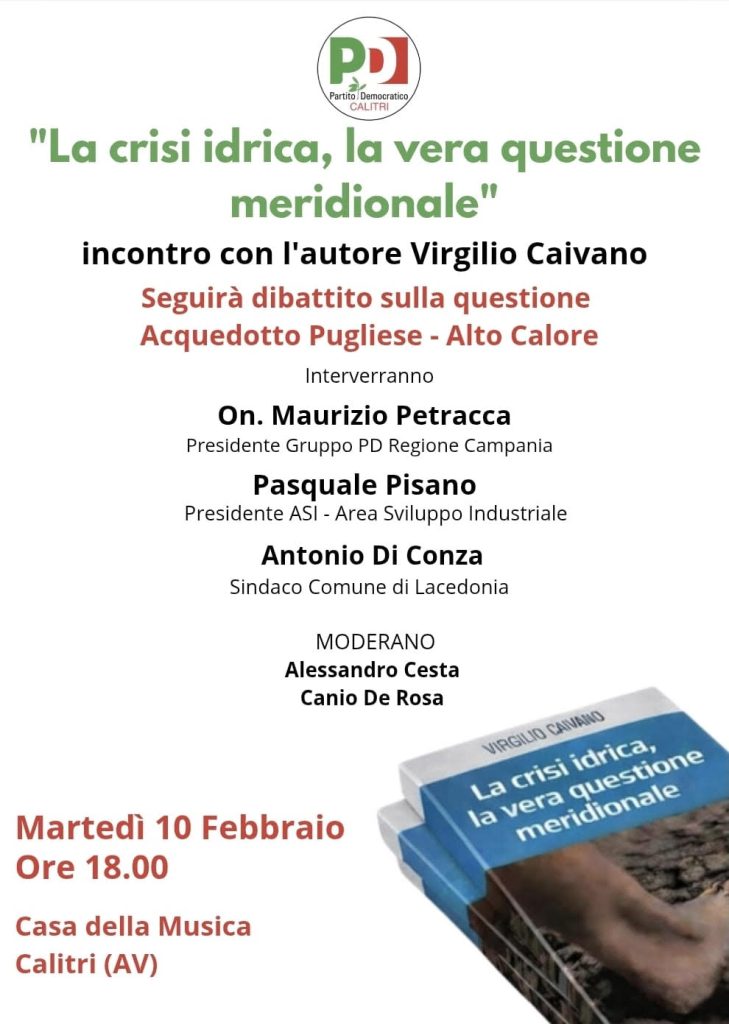 Martedì 10 febbraio, alle ore 18:00, la Casa della Musica di Calitri ospiterà un incontro di grande rilievo sul futuro delle risorse idriche dell’Alta Irpinia. Al centro del dibattito la presentazione del libro di Virgilio Caivano, “La crisi idrica, la vera questione meridionale”, che affronta le criticità della gestione idrica nel Mezzogiorno. L’iniziativa, promossa dal Partito Democratico di Calitri, si concentra sulla delicata transizione di alcuni comuni dall’Acquedotto Pugliese all’Alto Calore, un passaggio che coinvolge amministratori e cittadini e solleva interrogativi sulla qualità del servizio e sulla sicurezza delle infrastrutture locali.All’incontro interverranno: