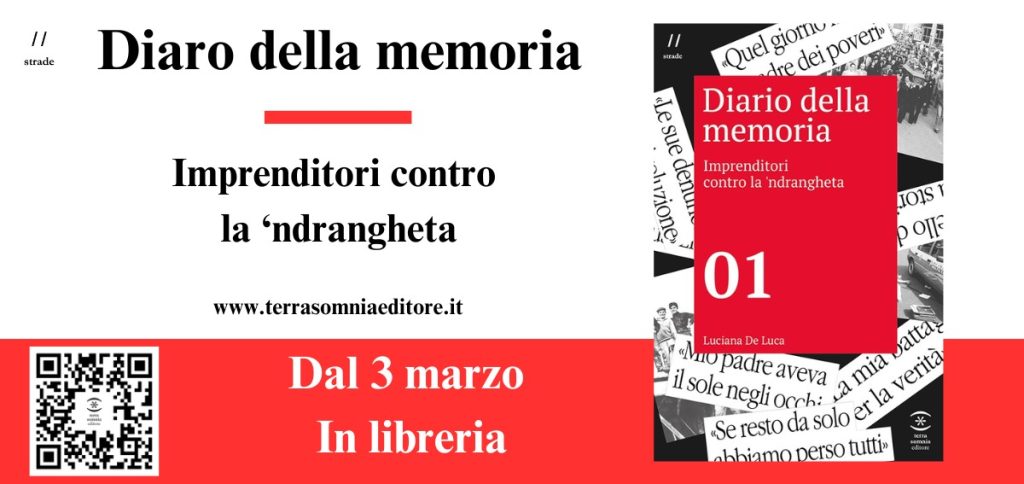 “Tre, sette, trenta, cinquanta? Per quanti giorni rimane alta l’attenzione pubblica sulla notizia di un imprenditore ucciso dalla mafia perché si rifiutava di pagare il pizzo? Forse duecento? E poi?”. (dalla prefazione di Rocco Valenti, già Direttore Responsabile del Quotidiano del Sud). Dal 3 marzo 2025, Diario della Memoria, il libro della giornalista Luciana De Luca, è in libreria con le storie degli imprenditori calabresi uccisi per essersi opposti alle richieste della ‘ndrangheta e di chi, rimasto in vita, ha denunciato e vive da anni sotto scorta. Le drammatiche testimonianze dei familiari mettono in luce il calvario vissuto, raccontano di vite cambiate in corsa e di esistenze depredate dalla violenza mafiosa. Ma c’è chi ha reagito e ha trasformato il suo dolore in impegno. Tanti, troppi i figli orfani di una guerra combattuta a mani nude, custodi di una memoria dolorosa, abbandonati da uno Stato che non solo non li ha protetti e sostenuti ma gli ha persino negato verità e giustizia. Venticinque storie di imprenditori calabresi uccisi o minacciati dalla ‘ndranggeta, che messe insieme riscrivono un pezzo di storia del nostro Paese. Storie che l’autrice, cronista attenta e scrupolosa, ha nel tempo narrato sul Quotidiano del Sud e che ora Terra Somnia Editore, con la Fondazione Mario Dodaro e Cassa di Risparmio di Calabria e di Lucania, porta all’attenzione dei lettori.
