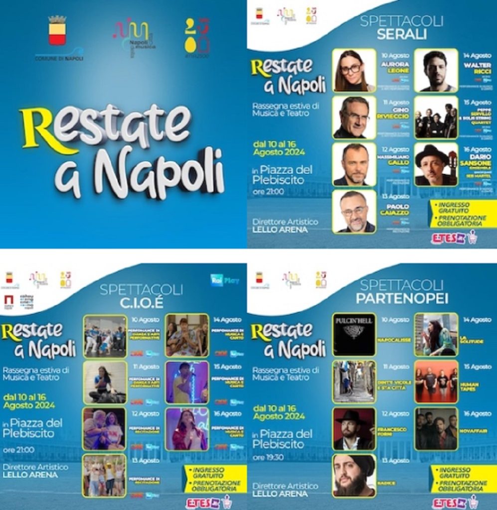 La V° edizione di “Restate a Napoli” torna a Piazza Plebiscito: arte, musica e teatro dal vivo nel cuore della città. Con Massimiliano Gallo, Gino Rivieccio, Dario Sansone, Walter Ricci, Aurora Leone, Peppe Servillo, Solis String Quartet, Paolo Caiazzo e gli allievi di C.I.O.E.’ per un totale complessivo di 21 spettacoli in sette giorni. Attive le prenotazioni. Dal 10 al 16 agosto 2025 Piazza del Plebiscito di Napoli diventa un teatro a cielo aperto con 21 spettacoli in sette giorni ad ingresso libero (con prenotazione su https://bit.ly/RestateaNapoli2025 ) per i cittadini e i turisti che restano in città. La rassegna è promossa e finanziata dal Comune di Napoli e inserita nel macro progetto Napoli Città della Musica. In scena anche sette spettacoli dei 60 allievi dell’Accademia C.I.O.E.’ – il nuovo talent di RaiPlay finanziato dal Comune di Napoli e voluto dal Sindaco Gaetano Manfredi. Restate a Napoli 2025”: Piazza del Plebiscito si trasforma in un palcoscenico di arte, cultura e inclusione sociale. Così Napoli si presenta al cittadini e ai turisti per fargli vivere una settimana magica con la quinta edizione della più importante rassegna estiva che dal 10 al 16 agosto trasformerà la piazza simbolo di Napoli in un vibrante teatro a cielo aperto, regalando alla città sette giorni di spettacoli gratuiti tra musica, teatro e danza. Diretta da Lello Arena, figura emblematica della scena artistica italiana, la manifestazione si conferma come trait d’union tra tradizione e innovazione sotto il cielo stellato di Partenope.