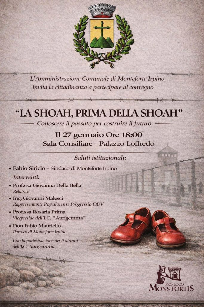 Monteforte Irpino si prepara a vivere una serata di forte impatto civile e culturale. Martedì 27 gennaio, in occasione della Giornata Internazionale della Memoria, la Sala Consiliare di Palazzo Loffredo ospiterà il convegno “La Shoah, prima della Shoah. Conoscere il passato per costruire il futuro”, promosso dall’Amministrazione comunale guidata dal sindaco Fabio Siricio, con il coordinamento dell’assessore alla Cultura Francesca De Santis. L’iniziativa nasce da un’idea precisa: raccontare la Shoah non solo come l’orrore finale dei campi di sterminio, ma come un processo graduale fatto di discriminazioni, leggi razziali, esclusioni, propaganda e indifferenza. Un percorso che mostra come una società democratica possa lentamente abituarsi all’ingiustizia fino a considerarla normale. “Il Comune non è solo luogo ospitante, ma garante di una memoria che parla al presente – sottolinea l’assessore De Santis –. La Shoah non comincia con Auschwitz, ma con l’espulsione degli ebrei dalle scuole, dai luoghi di lavoro, dalla vita civile. È su questo “prima” che vogliamo accendere una riflessione”. Il convegno è stato pensato come un evento capace di parlare anche attraverso i simboli. La sala sarà allestita con sedie vuote, sulle quali compariranno i nomi e le professioni di cittadini realmente colpiti dalle leggi razziali del 1938: una scenografia essenziale, ma di grande forza evocativa. Un ruolo centrale sarà affidato agli studenti dell’Istituto Comprensivo “Aurigemma”, protagonisti non come attori ma come testimoni della memoria. Saranno loro a dare voce a quelle persone cancellate dalla società, restituendo dignità a storie spesso dimenticate. Prevista anche la recitazione di poesie e la partecipazione della Pro Loco. Ad aprire l’incontro saranno i saluti del sindaco Fabio Siricio. Seguirà l’intervento della relatrice Giovanna Della Bella, mentre Giovanni Malesci, dirigente del Ministero della Giustizia e rappresentante di “Populorum Progressio ODV”, affronterà il tema “Come una società arriva alla Shoah”. In rappresentanza della scuola interverrà la vicepreside Rosaria Prima. Le conclusioni saranno affidate a don Fabio Mauriello, parroco di Monteforte. Un appuntamento che non vuole limitarsi al ricordo, ma trasformare la memoria in consapevolezza civica, affinché ciò che è accaduto non resti confinato al passato, ma continui a interrogare il presente e a orientare il futuro.