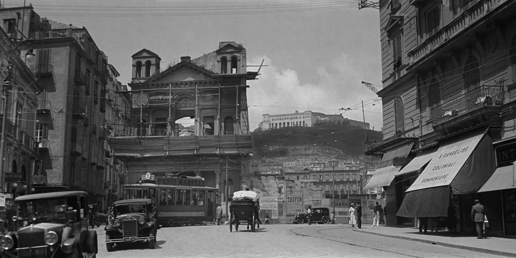 Il Palazzo della Provincia di Napoli, progettato dagli architetti Marcello Canino (1895-1970) e Ferdinando Chiaromonte (1902-1945) nel 1934 e inaugurato nell’ottobre del 1936, si trova nel cuore del Rione Carità. L’edificio è improntato ad un razionalismo monumentale e ha una planimetria insolita a forma di pentagono irregolare, con un cortile centrale. L’alzato di sviluppa in sei piani fuori terra e un piano interrato. Il palazzo, nella parta esterna è completamente rivestito in marmo e litoceramica Klinder, ed impreziosito dallo splendido portale istoriato in bronzo con bassorilievi raffiguranti scene della società fascista realizzato dallo scultore Carlo De Veroli (1890-1938) con la fusione della prestigiosa Fonderia/Marmeria Chiurazzi, e dal bassorilievo del Cavallo Rampante, simbolo della Provincia di Napoli, posto sulla cornice marcapiano, e opera dello scultore Gaetano Chiaromonte (1872-1962). Dal cortile, anch’esso rivestito in pietra lavorata, attraverso lo scalone monumentale in marmo porfirico, dove si conserva il gonfalone storico, si accede direttamente al Salone d’onore che conserva ancora gli arredi d’epoca come lo splendido lampadario in cristallo e gli scranni lignei intarsiati con lo stemma della Provincia di Napoli.Nei corridoi del primo piano, destinati alle sale degli organi politici e istituzionali, possono ammirarsi le preziose foto d’epoca dell’archivio Parisio-Troncone in cui si documentano tutte le fasi della demolizione dell’antico Rione San Giuseppe e della costruzione del nuovo Rione Carità. Le sale degli uffici sono invece arredate con una parte delle opere della prestigiosa Collezione d’arte della Città Metropolitana di Napoli, formatasi a partire dal periodo postunitario, dipinti e sculture che solitamente non sono esposte al pubblico, e tra cui spicca il famoso Cavallo Sfrenato di Filippo Palizzi (1818-1899), custodito nella sala del Sindaco della Città Metropolitana di Napoli insieme a un raro documento di archivio: il “Ricordo del 2° Congresso Provinciale” del 1905 di Alfredo Girosi. Nel percorso di visita, inoltre, sarà possibile ammirare altri dipinti come Anton Sminck van Pitloo “Paesaggio da Mergellina” (1827), Giovanni Ponticelli “Il vero supplizio di Tantalo” (1871), Francesco Dell’Erba “Le beffe dell’ubbriaco” (1878), Giuseppe Sciuti “La pace domestica” (1870), Maria Spanò “Ricordo di Sorrento” (1872), Gustavo Mancinelli “Corradino e suo cugino Federico nel momento prima di essere condotti al patibolo” (1868) o sculture come quella sullo scalone monumentale di Alberto Ferrer “Caddi come corpo morto cadde” del primo decennio del XX secolo in bronzo patinato o il gesso bronzato del 1940 di Luigi Martorelli “Divinità Fluviale”. Nel corridoio del primo piano una sequenza di 20 fotografie in bianco e nero dell’Archivio Parisio-Troncone che documentano la distruzione del rione Carità e la sua ricostruzione post-bellica.