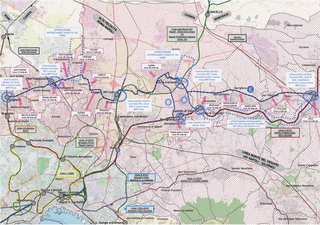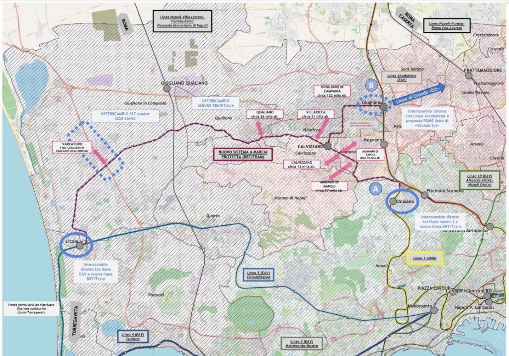 Nel PUMS approvato dal Consiglio Metropolitano, dunque, tra i vari interventi previsti, è stato evidenziato come, allo stato attuale, i comuni a nord dell’area metropolitana non siano adeguatamente collegati tra loro da servizi in sede fissa. Il sistema, infatti, è sostanzialmente caratterizzato da linee radiali dirette, come i raggi delle ruote di una bici, verso il fuoco rappresentato da Napoli città. Quindi, ciascun comune è collegato, in qualche modo, al capoluogo: occorre, dunque, creare collegamenti tra i vari comuni dell’hinterland. Esigenza ancor più evidente in considerazione della presenza della stazione ferroviaria dell’alta velocità di Afragola. È da qui che nasce l’idea del Piano di prevedere la realizzazione di 2 nuove linee di gronda a nordest e a nordovest di Napoli, che si combinano con le linee esistenti in sede fissa gravitanti principalmente sulla città con cui vanno a formare un unico sistema complesso e integrato. Due linee di gronda che collegano, nell’area ovest, l’area di Chiaiano, nel comune di Napoli, con Licola, passando per Calvizzano e altri comuni, mentre a est, la zona di Giugliano con le aree vesuviana e nolana passando per le zone di Cardito, Afragola e Acerra, servendo una popolazione di più di mezzo milione di persone. Il documento prodotto in base all’Accordo con il MASE costituirà il primo passo per successivi stadi di progettazione, per i quali la Città Metropolitana ha già previsto lo stanziamento di fondi, in linea con le previsioni programmatiche dell’Ente.