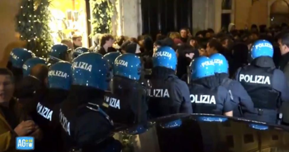 Ad attenderli la polizia schierata e in tenuta antisommossa che chiudeva l’ingresso della Piazza. I fumogeni, gli slogan e poi alcuni momenti di tensione con gli agenti che hanno sbarrato la strada e hanno colpito alcuni manifestanti con i manganelli. Alcuni sarebbero rimasti feriti alla testa e alle mani, altri identificati.