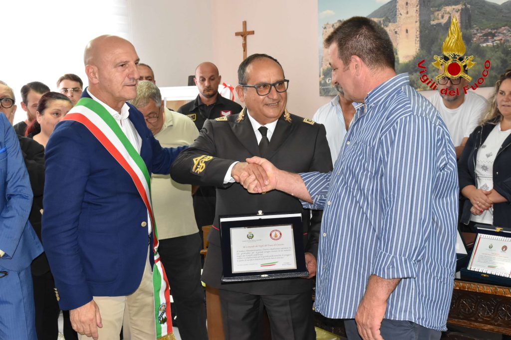Si è svolta oggi, presso il municipio del comune di San Felice a Cancello, la cerimonia organizzata dal sindaco Dott. Emilio Nuzzo e il delegato alla protezione civile locale, Dott, Fiorenzo Della Rocca, con la presenza dei familiari delle due vittime della frana (Giuseppe Guadagnino e Agnese Milanese). Nella cerimonia è stata consegnata una targa al comandante dei Vigili del Fuoco Ing. Paolo Massimi e alla dirigente regionale della Protezione civile Dott.ssa Claudia Campobasso per l’impegno profuso dai Vigili del Fuoco e dal personale della protezione civile in occasione della frana del 27 agosto che colpì la popolazione di San Felice a Cancello. Presenti alla cerimonia anche il Direttore della Direzione Vigili del Fuoco della Campania Ing. Paoloantoni, la Croce Rossa e una rappresentanza di giovani calciatori dell’Oasi Sanfeliciana che a loro volta hanno consegnato al comandante un loro riconoscimento per il soccorso svolto.