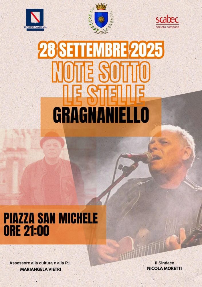 Domenica 28 settembre 2025, alle ore 21:00, in Piazza San Michele a Solofra, in provincia di Avellino, si terrà il concerto di Enzo Gragnaniello, straordinaria voce della canzone napoletana e autore di indimenticabili melodie che hanno segnato la musica italiana. L’iniziativa, dal titolo “Note sotto le stelle”, rientra nel programma di valorizzazione culturale promosso dal Comune di Solofra in collaborazione con la Regione Campania e la Scabec – Società Campana Beni Culturali. Il concerto offrirà al pubblico un’occasione unica per vivere un momento di grande emozione collettiva, immersi nella suggestiva cornice della piazza principale del paese, sotto il cielo stellato di fine settembre.